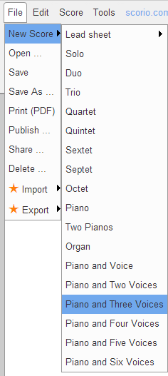 - In the File/New Score menu you will find several templates for your score (e.g. Piano or Quartet).